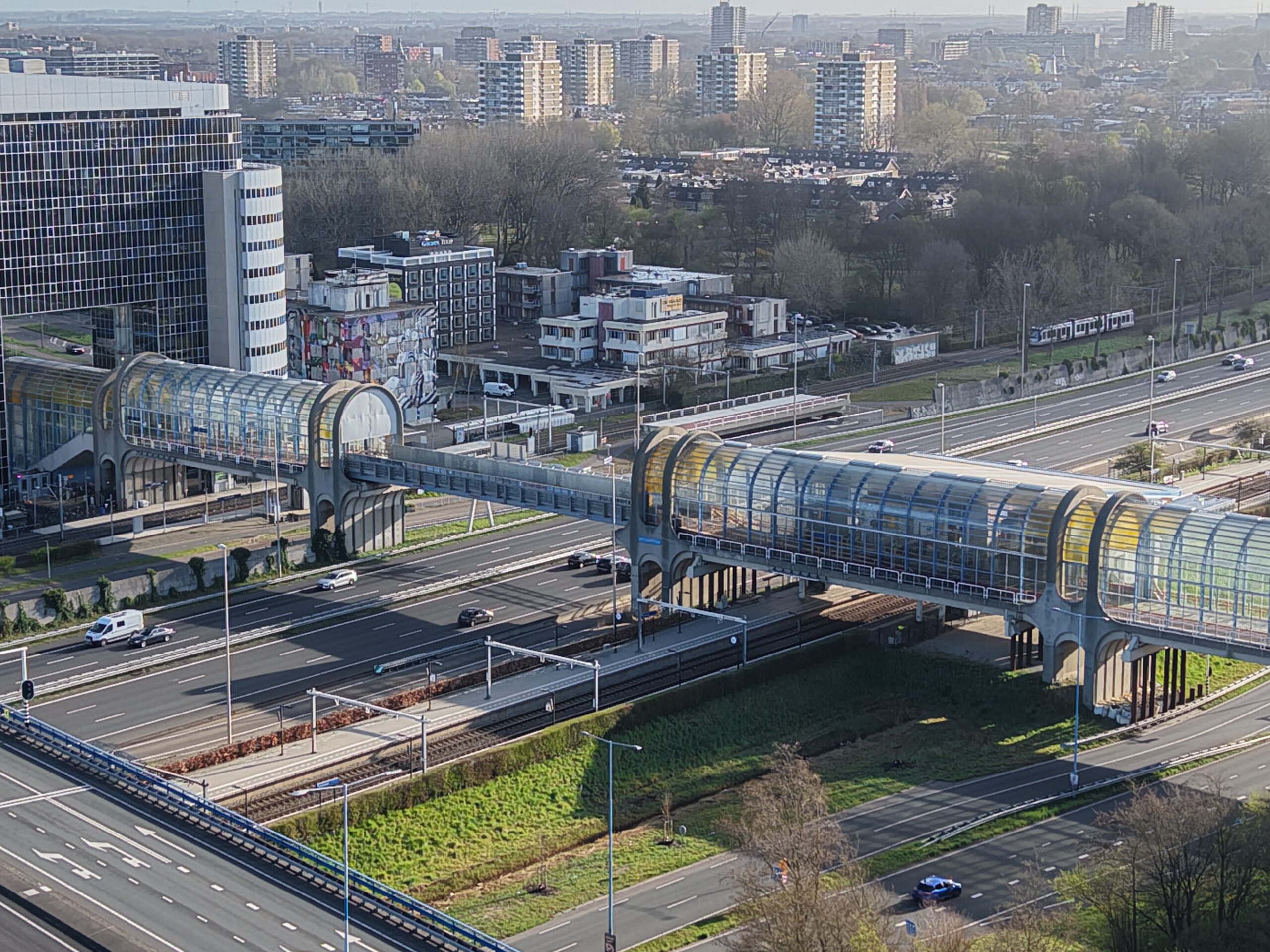 Een brug in volle glorie, met een helder overzicht van de verkeersstromen en omliggende omgeving. Ideaal voor architecten en stedenbouwkundigen die werken aan ruimtelijke planning en mobiliteitsoplossingen.