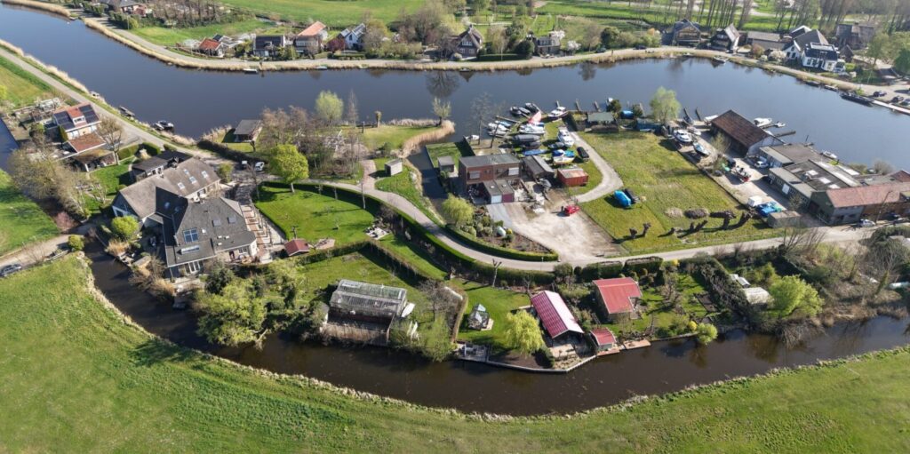 Deze luchtfoto toont een schilderachtig dorpje, volledig omringd door water. De unieke ligging benadrukt de relatie tussen mens en landschap, en biedt waardevolle inzichten voor ruimtelijke ordening, waterbeheer en dorpsontwikkeling. Ideaal voor architecten en stedenbouwkundigen die werken aan leefbare, klimaatbestendige gemeenschappen.